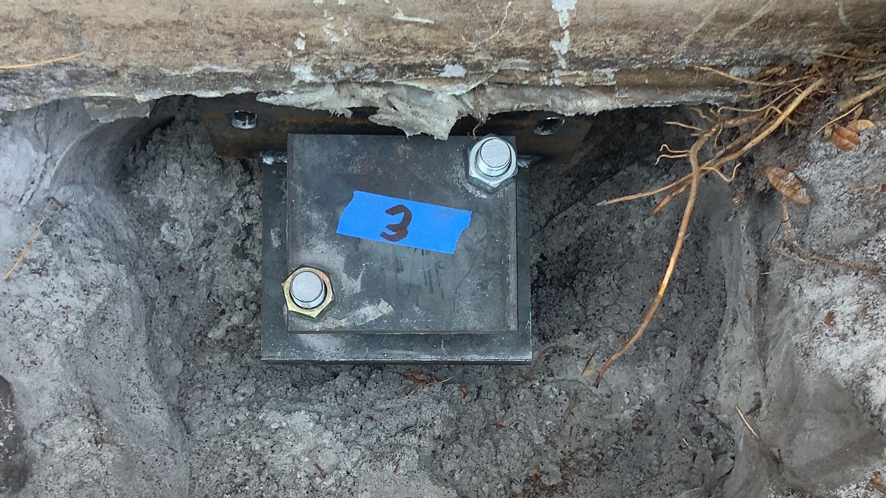 Helicon installed six (6) helical piers to provide a deep, verifiable bearing system and a platform for controlled lift. Helical piers are torque‑driven steel elements with helical plates that engage competent soil at depth. Installation torque correlates with capacity, providing quantified QA/QC during placement. Once design torque is achieved, brackets connect the porch’s load path to the pier shafts so that loads bypass weak near‑surface soils.