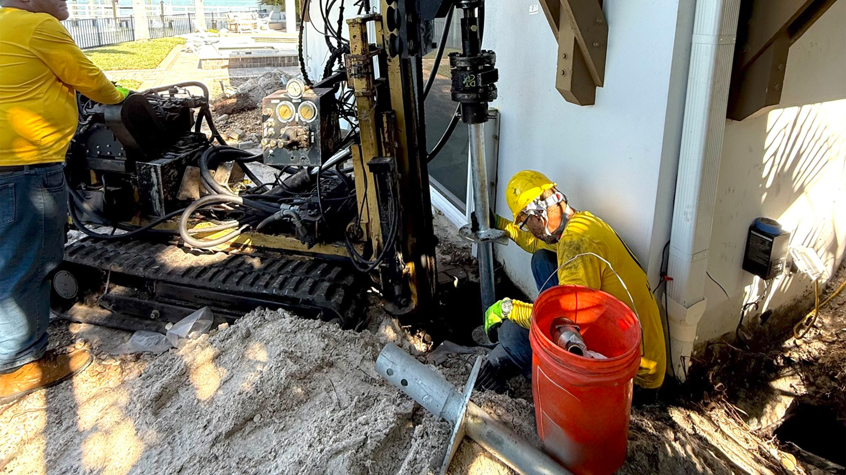 Helical pier installation typically requires a hydraulic drive motor mounted on specialized equipment. However, portions of the home provided very limited access space, making it difficult to position the drilling equipment.