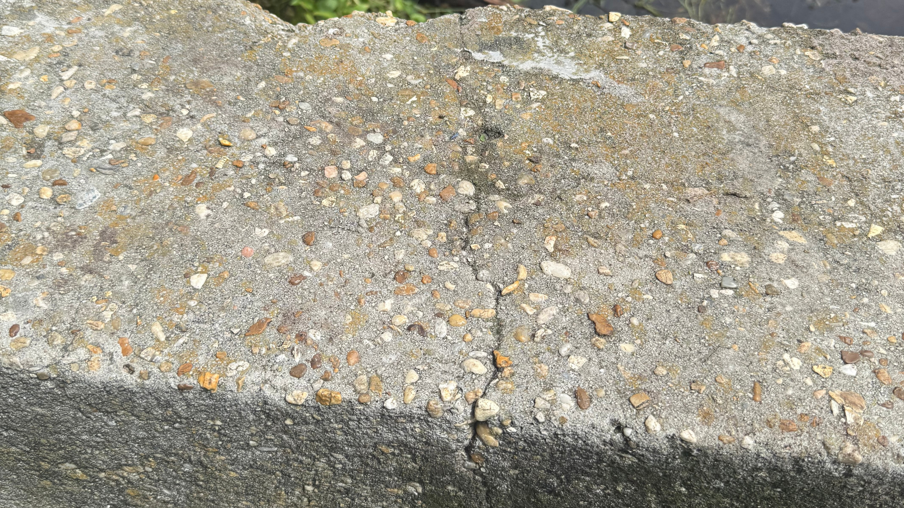 - Main Spillway: Multiple long cracks extending from crest to waterline, prior failed patchwork, vegetation growth in cracks, exposed aggregate, and joint separation.